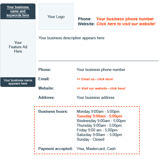 The reason we ask you for these is because, as a partner with Google and other search engines, we can provide this information direct to them. This then provides you with better placement in Google Maps (Local Search) and can have a positive influence on your "regular" search engine rankings. In addition, enhanced content also gives your listing a boost in our own results.